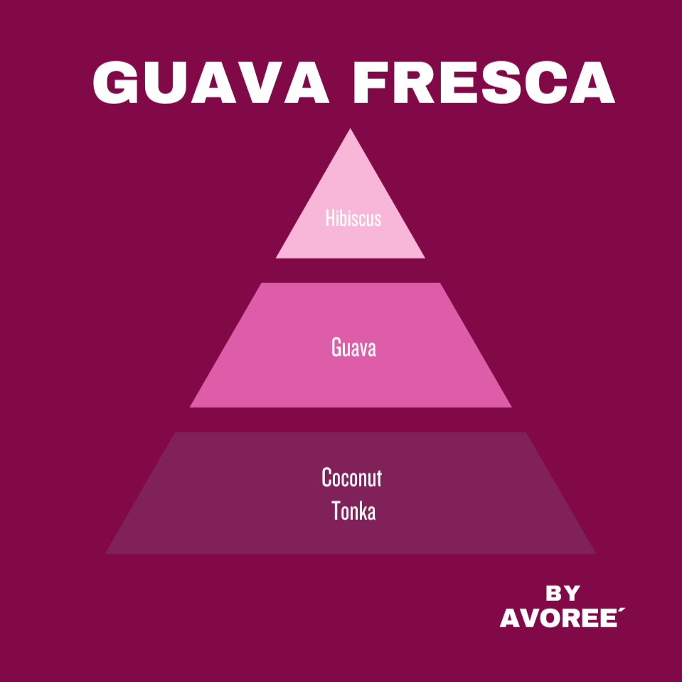 Guava Fresca opens with the bright, tart freshness of hibiscus, evoking floral notes of flor de Jamaica agua fresca. At its heart, juicy guava brings a sweet, tropical fruitiness. The base is rounded out by creamy coconut, adding a soft, warm, and comforting richness that lingers gently on the skin.